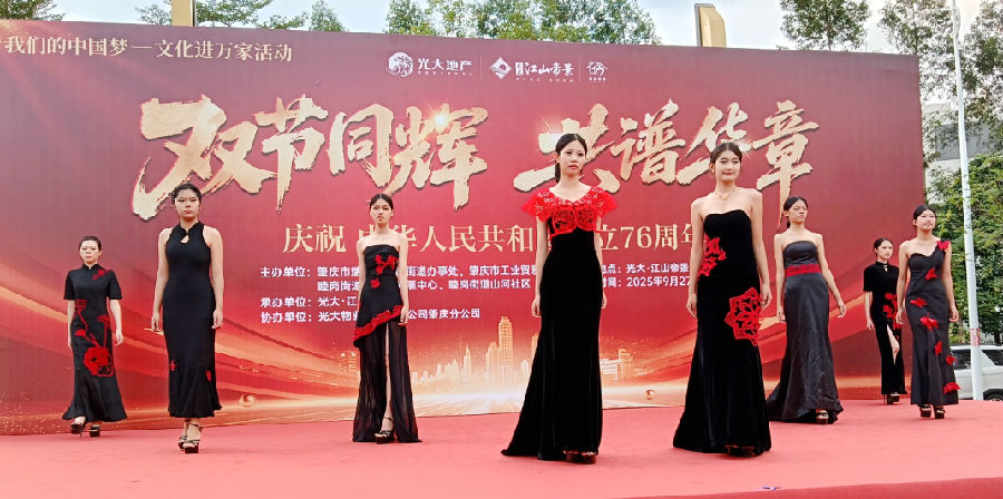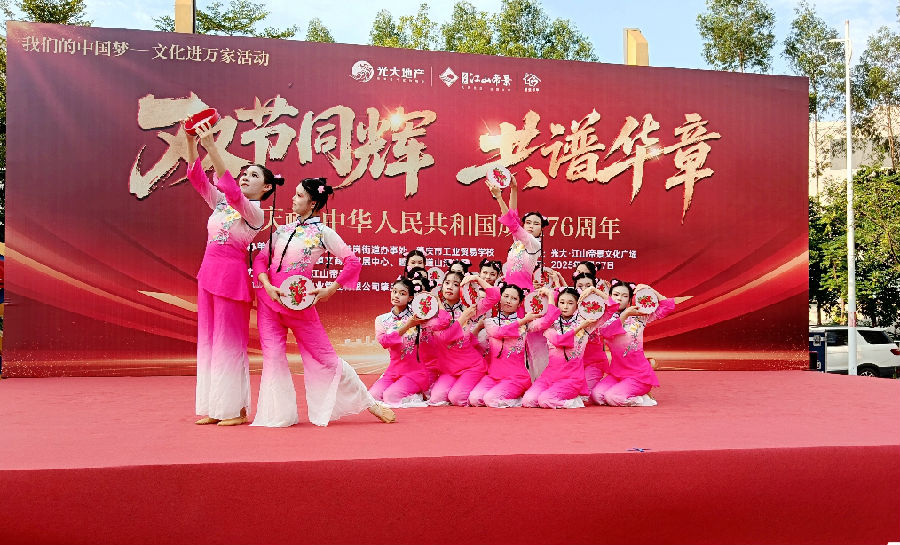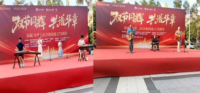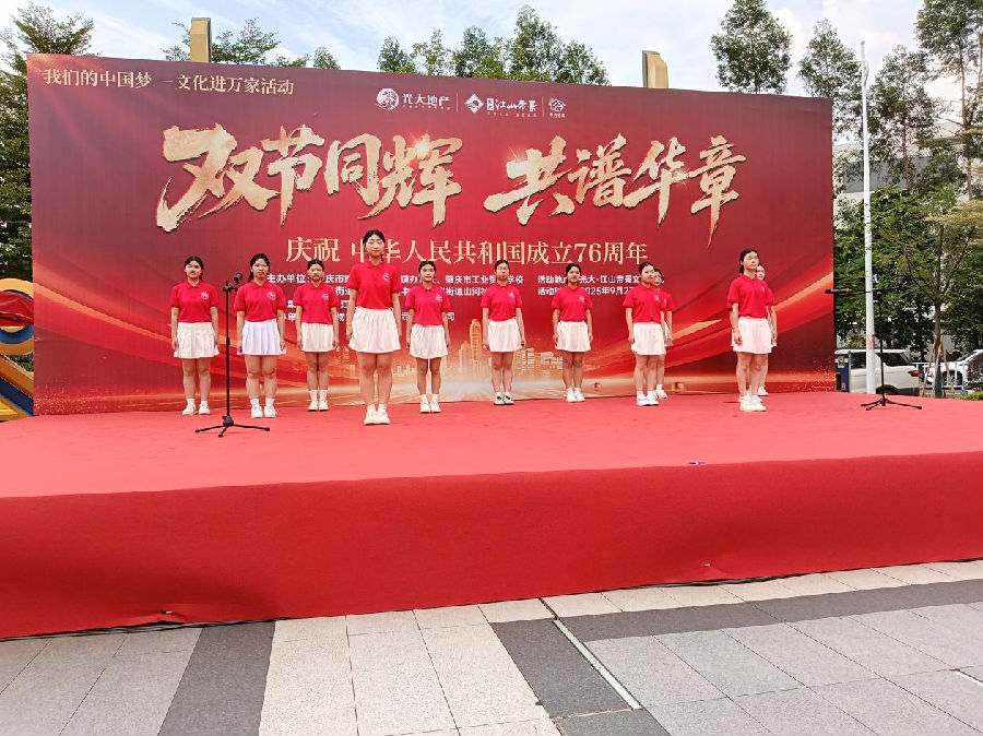 9日27下午,由肇庆市端州区睦岗街道办事处、肇庆市工业贸易学校、睦岗街道文商旅发展中心、睦岗街道山河社区主办,光大·江山帝景承办的“双节同辉 共谱华章”庆祝中华人民共和国成立76周年文艺表演在光大锦绣山河江山帝景文化广场举行。